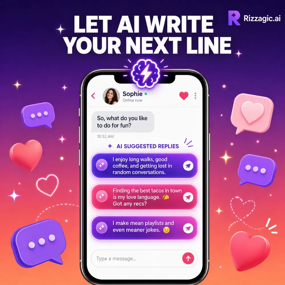 Level up your game with 40+ flirty AI-generated replies to keep the rizz going. Perfect for Tinder, Bumble, and Hinge. Powered by Rizzagic's AI wingman.